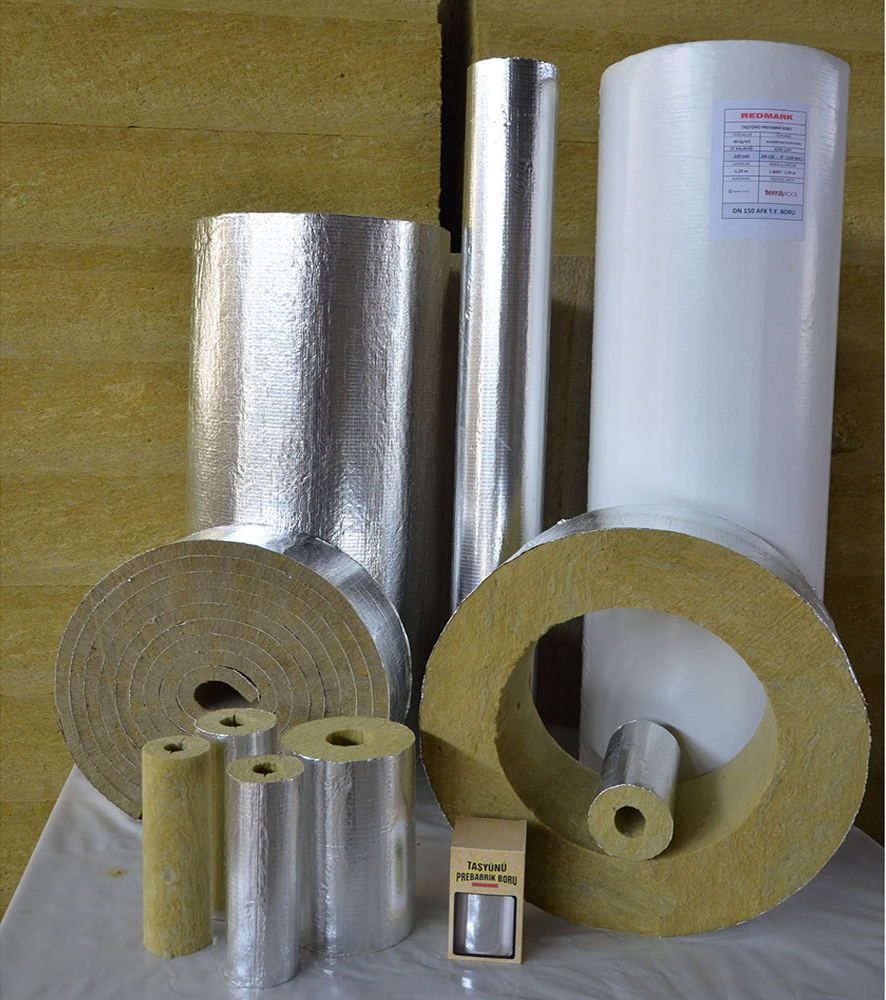 Sıcak ve soğuk tesisat yalıtımında kullanılan ÇIPLAK veya ALÜMİNYUM FOLYO kaplı TAŞYÜNÜ PREFABRİK BORU malzemelerini üretiyoruz.